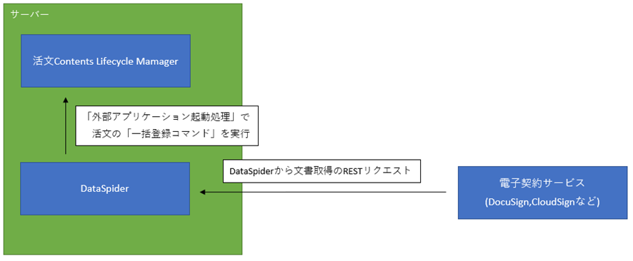 - DataSpiderから文書取得のためにアクセスする電子契約サービスは、他Webサービスなどに置き換えて考えていただくことも可能です。本稿では活文のコマンドをDataSpiderから実行して、任意のファイル(書類)を活文にアップロードするための手順を紹介していきます。