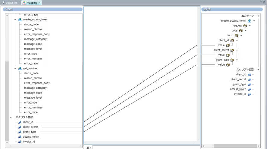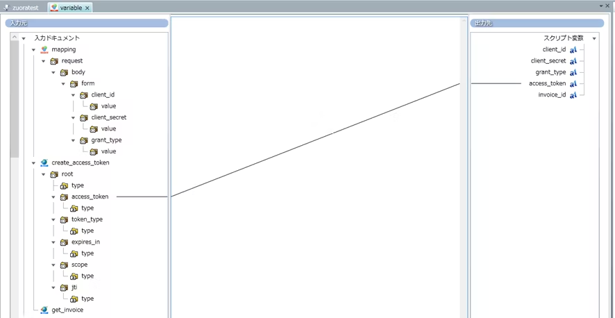 スクリプト変数として準備していた「client_id」「client_secret」「grant_type」を「create_access_token」のリクエストデータとしてマッピングしています。