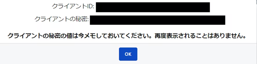 「作成」をクリックするとクライアントIDとクライントシークレット(「クライアントの秘密」と表記されていますが…)が表示されます。後でHULFT Squareの設定で使用するので保存しておいてください。特にクライアントシークレットは後から確認ができませんのでご注意ください。