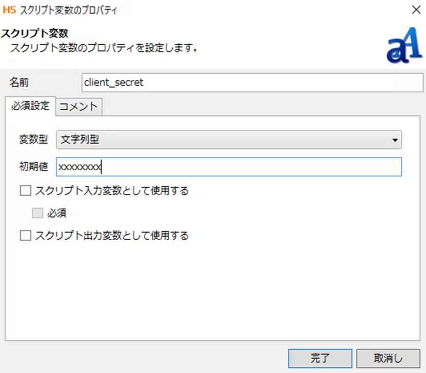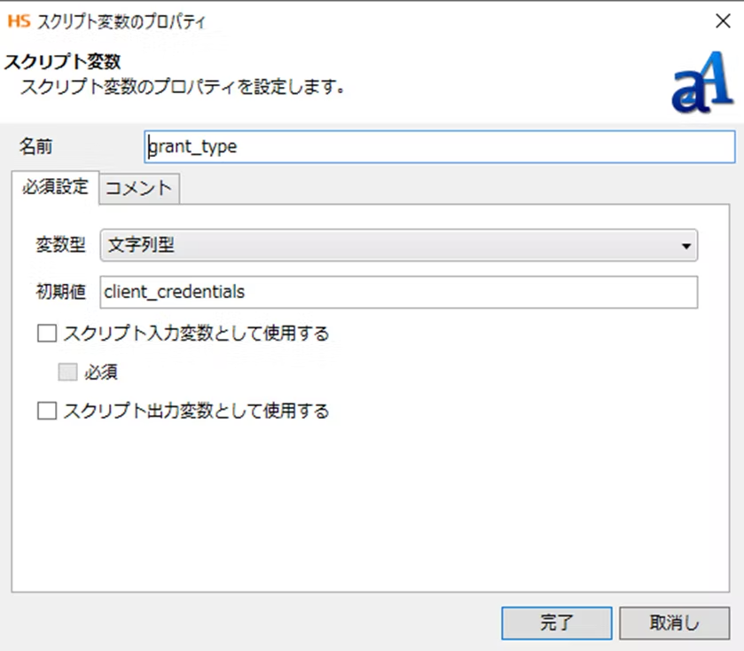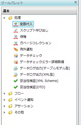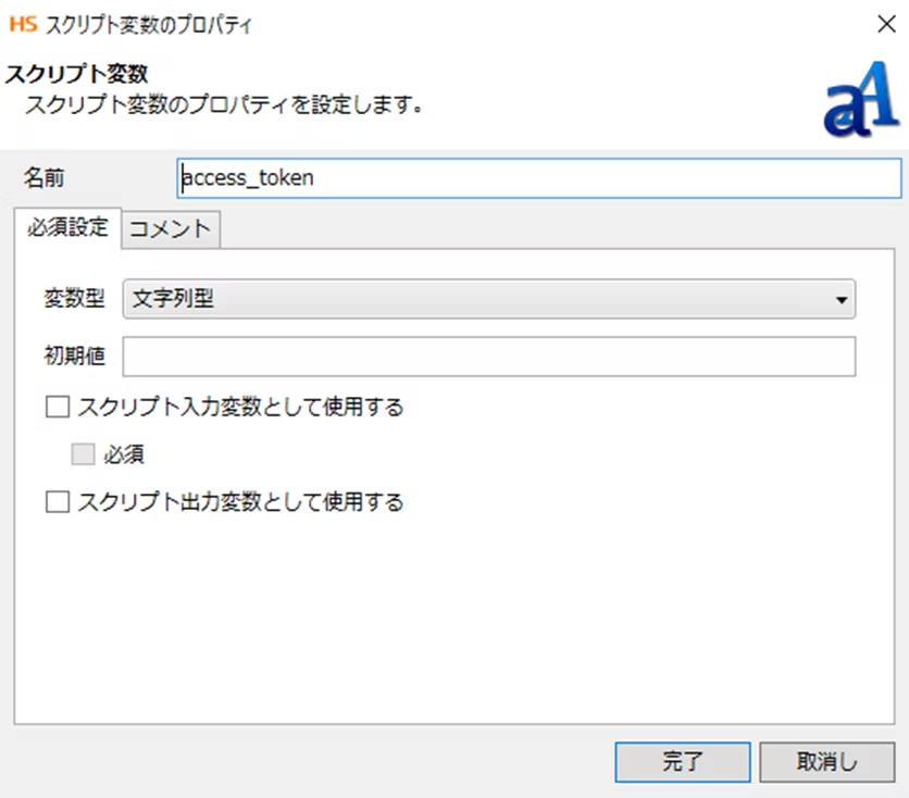 さらに、「create_access_token」で取得したアクセストークンの値をスクリプト変数「access_token」に保存するために「ツールパレット」の「基本」>「処理」>「変数代入」を選択して「create_access_token」の後ろに配置してください。
