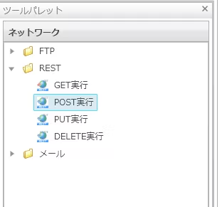 キャンバス右側の「ツールパレット」から「ネットワーク」>「REST」>「POST実行」を選択してキャンバス内にドラッグします。