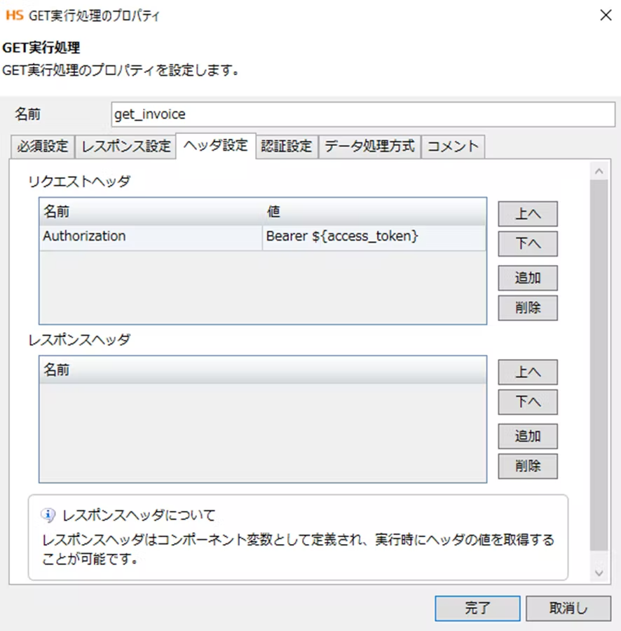 - リクエストヘッダ:「Authorization」ヘッダとして値「Bearer ${access_token}」を追加します。「create_access_token」で取得してスクリプト変数「access_token」に保存した値がここで使用されます。