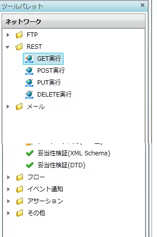 キャンバス右側の「ツールパレット」から「ネットワーク」>「REST」>「GET実行」を選択してキャンバス内にドラッグします。