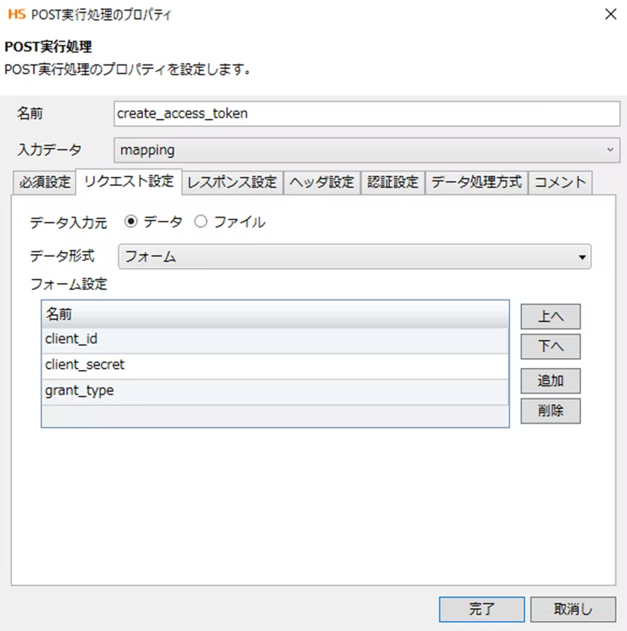 - フォーム設定:client_id,client_secret,grant_typeを追加