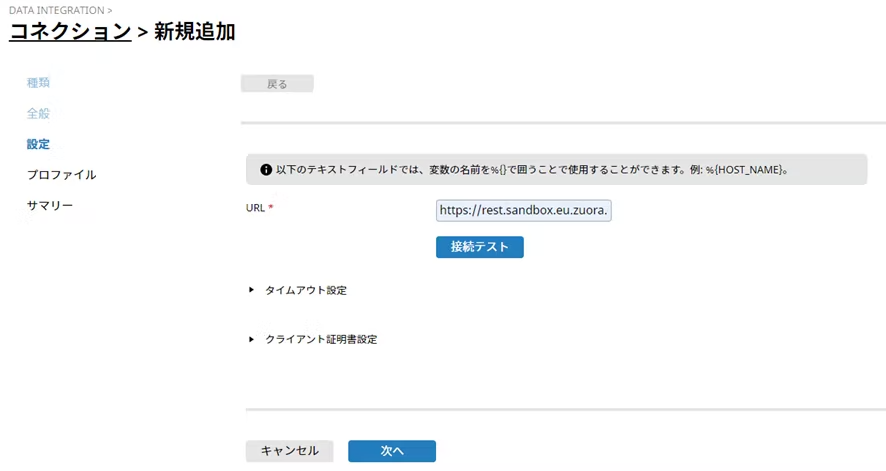 URL:ZuoraのURLを入力します。利用可能なURLの一覧は下記ページをご確認ください。