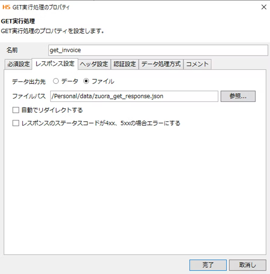 - データ出力先:ファイル。今回はHULFT Squareのストレージ上に請求書のデータファイルをそのまま生成します。