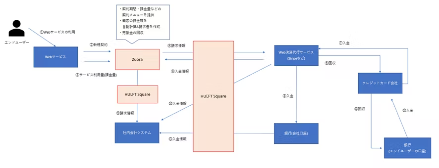 - ZuoraとWeb決済代行サービス・社内会計システムの間をHULFT Squareがデータ連携します。