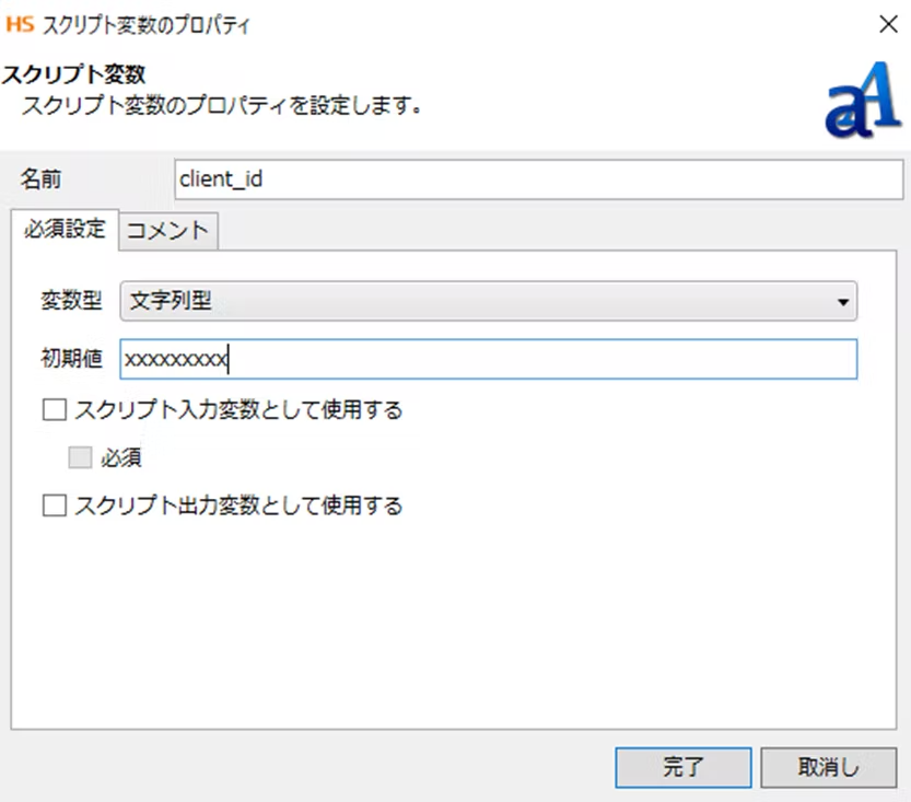 初期値:入力しません。後でスクリプトで取得した値を代入します。