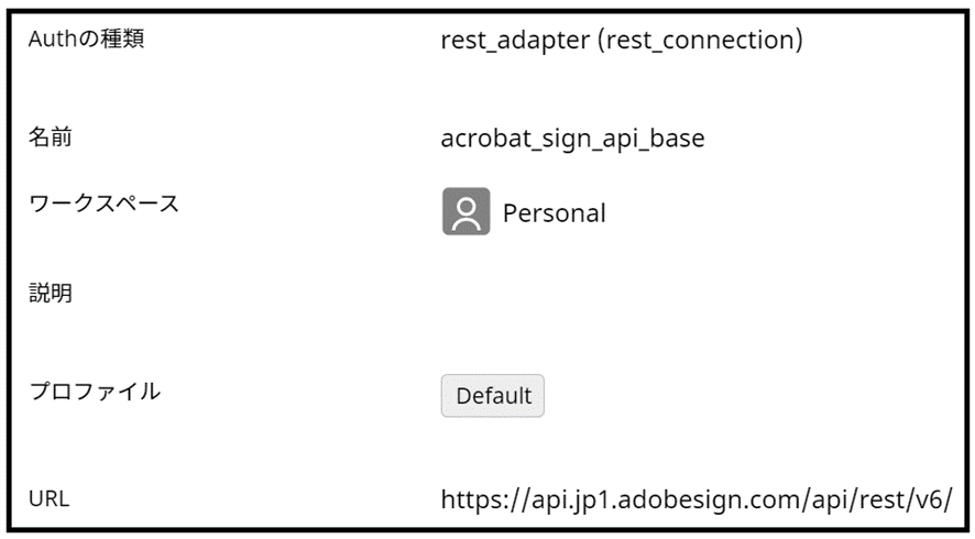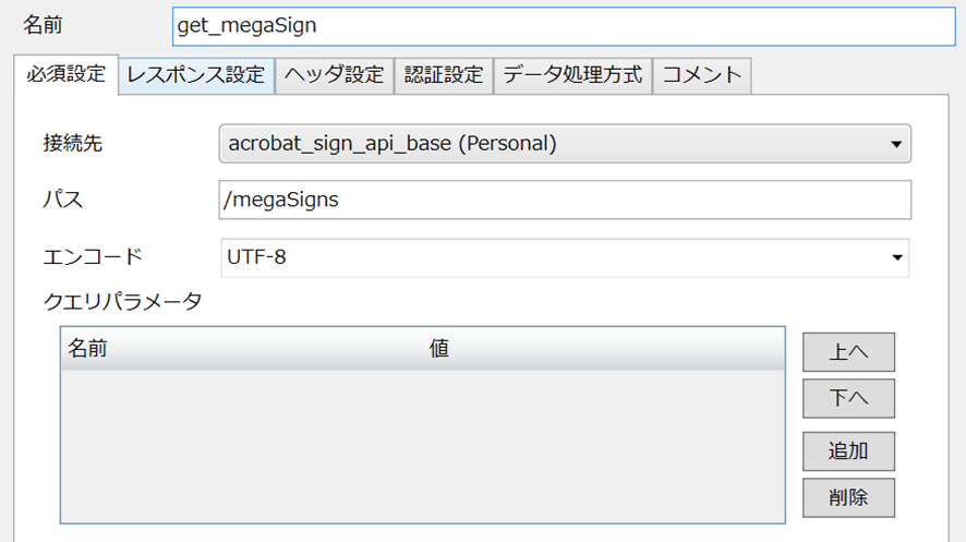 最後に認証設定タブの認証を[Authコネクション利用]に設定し、追加で表示された接続先から、先ほど作成した[Acrobat Sign_auth]を選択します。
