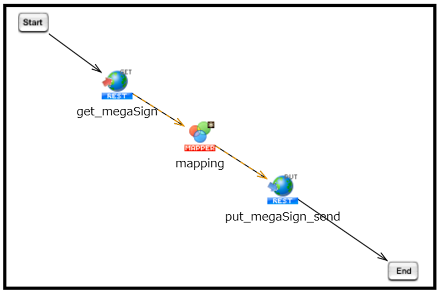 次に[start]を[get_megaSign]へドラック&ドロップします。こうすることでフローを作成することができます。同じように[get_megaSign]から[end]にもフローを作成して、上部メニューの以下のボタンをクリックします。これはスクリプトを実行するためのボタンです。