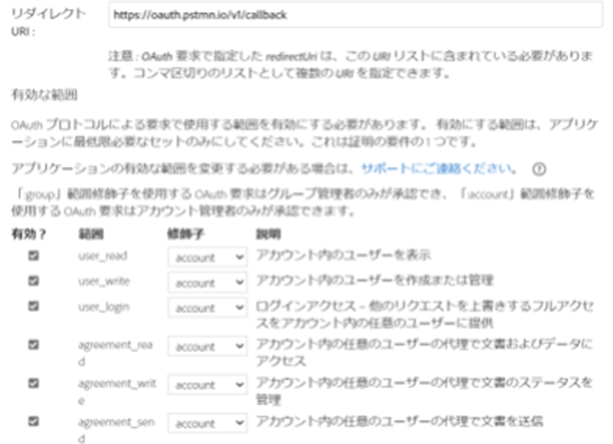 次にその隣にある青い[OAuthアプリケーション用に設定]をクリックして、OAuthの設定を行います。Hulft SquareのOAuthはcallbackに指定があるので、以下のようにリダイレクトURIにcallback URLを入力して、アプリケーションに任意の権限を与えます。(今回は契約書類の送信と取得を行うので、[agreement_read]と[agreement_write] にチェックを入れます。)