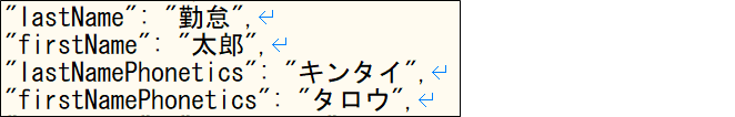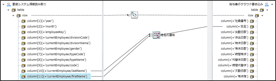 上図では「lastName」と「firstName」を連結して「氏名」に出力しています。「勤怠」と「太郎」が連結して「勤怠太郎」と出力されます。