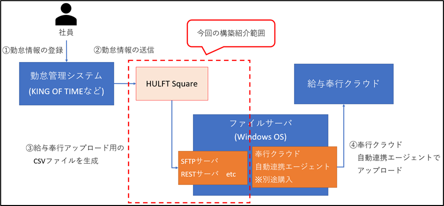 給与の計算に必要な勤怠情報の入力は、給与奉行クラウドのみを立ち上げた状態だと管理者が社員一人ずつを手作業で行う必要があります。そのままでは大変な作業となるので、HULFT Squareで他システムと連携させて自動化させる方法を考えてみました。