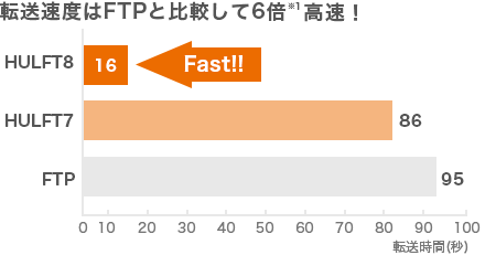 HULFT8は、高速なファイル転送を安定して行うために、データ圧縮に着眼。さらに、転送設定の自動チューニング機能を追加したことで、FTPと比較して6倍※1の転送速度を達成しました。これにより、遠距離転送や、大容量ファイルの転送、クラウドサービス間の転送時にも、特別なチューニングなしで安定したパフォーマンスを発揮します。