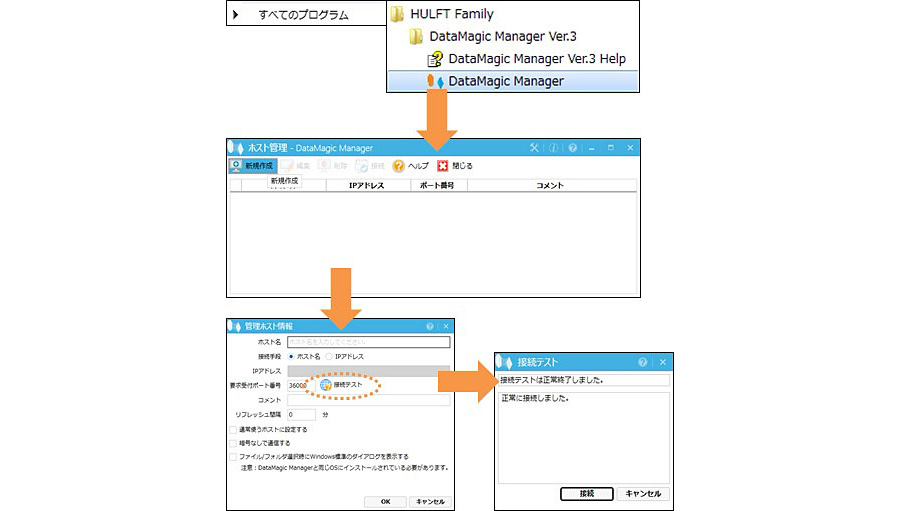 DataMagicがインストールされているホストへ接続するために、必要な情報の設定や登録を行います。