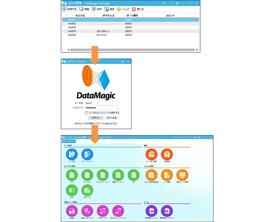 DataMagic Manager画面に登録されたホスト情報の一覧が表示されます。接続したいホスト名をダブルクリックすると、ログイン画面が表示されます。