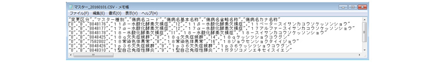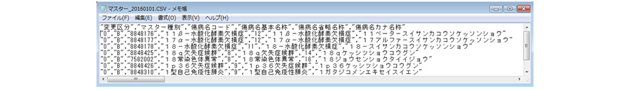 (項4.2.2)手順1が完了すると、出力設定において指定されたC:\WORK\sample1\マスター活用側企業\処理済フォルダ\に”マスター_20160101.CSV”というファイルが出来ているのでメモ帳等のエディタで確認して下さい。