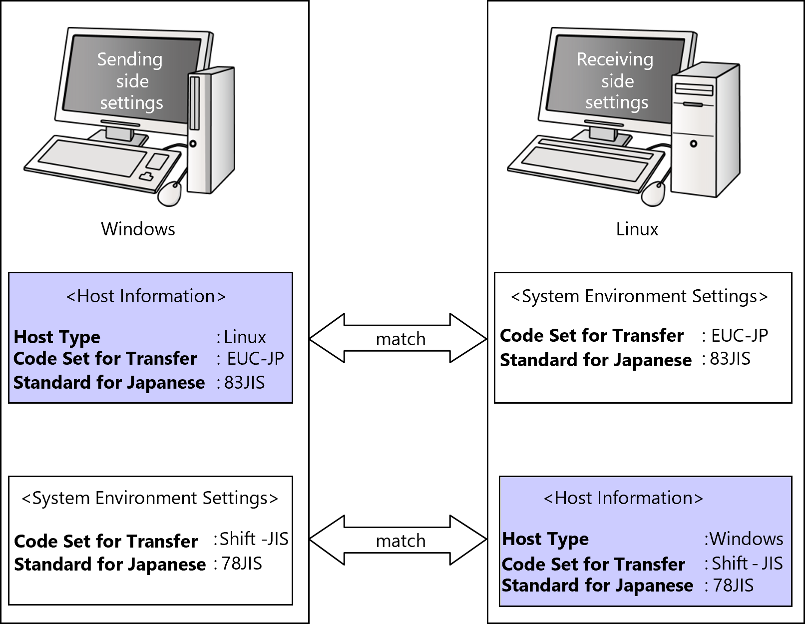 The settings for Code Set for Transfer (KCODETYPE) and for Standard for Japanese (JISYEAR) in the Host Information must match up with the settings of the corresponding fields in the System Environment Settings on the remote host.