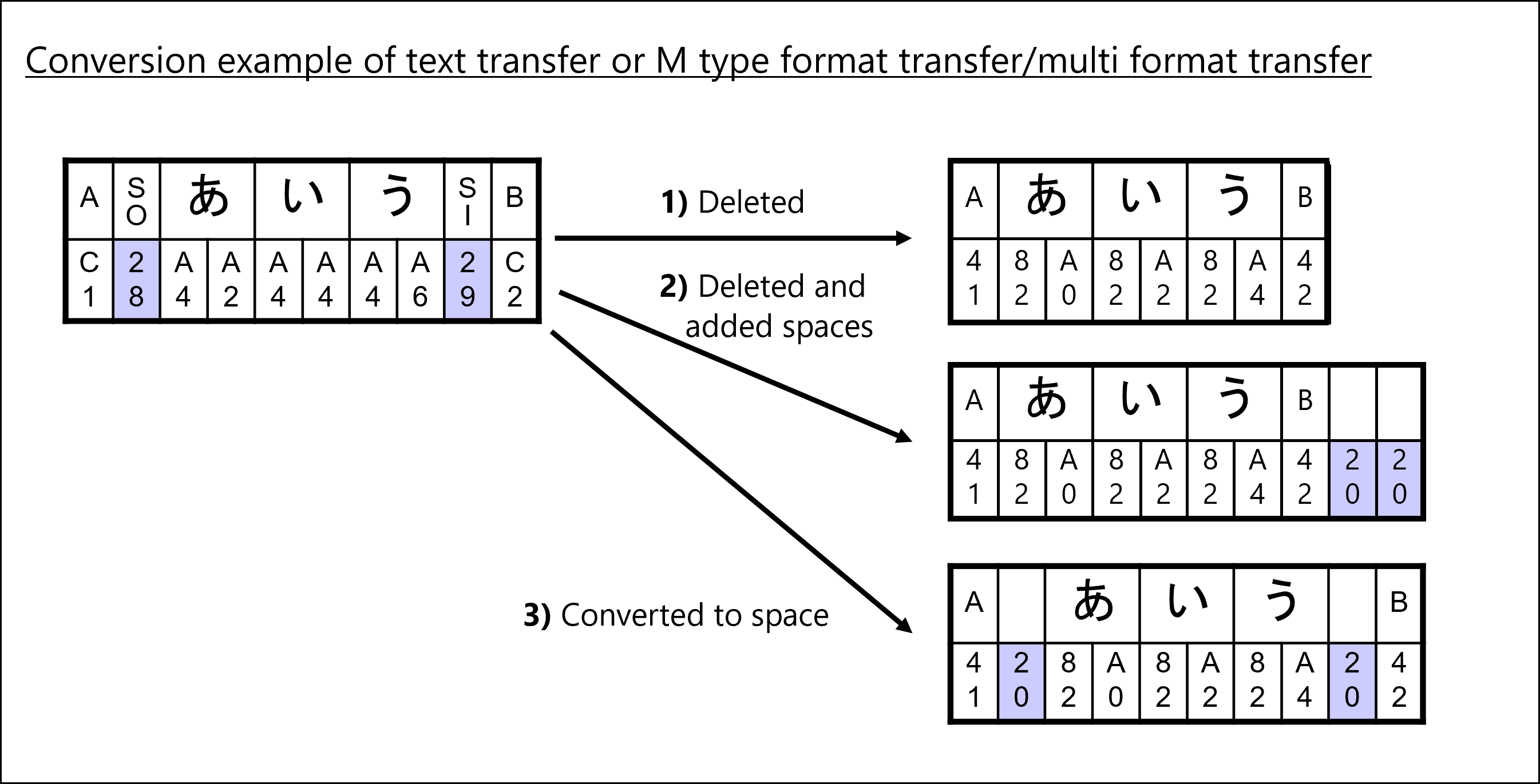When Shiftcode Mode in the Send Management Information is 'S (Space),' the data contains shift codes, and either of the following conditions is met, HULFT converts the shift codes into spaces: