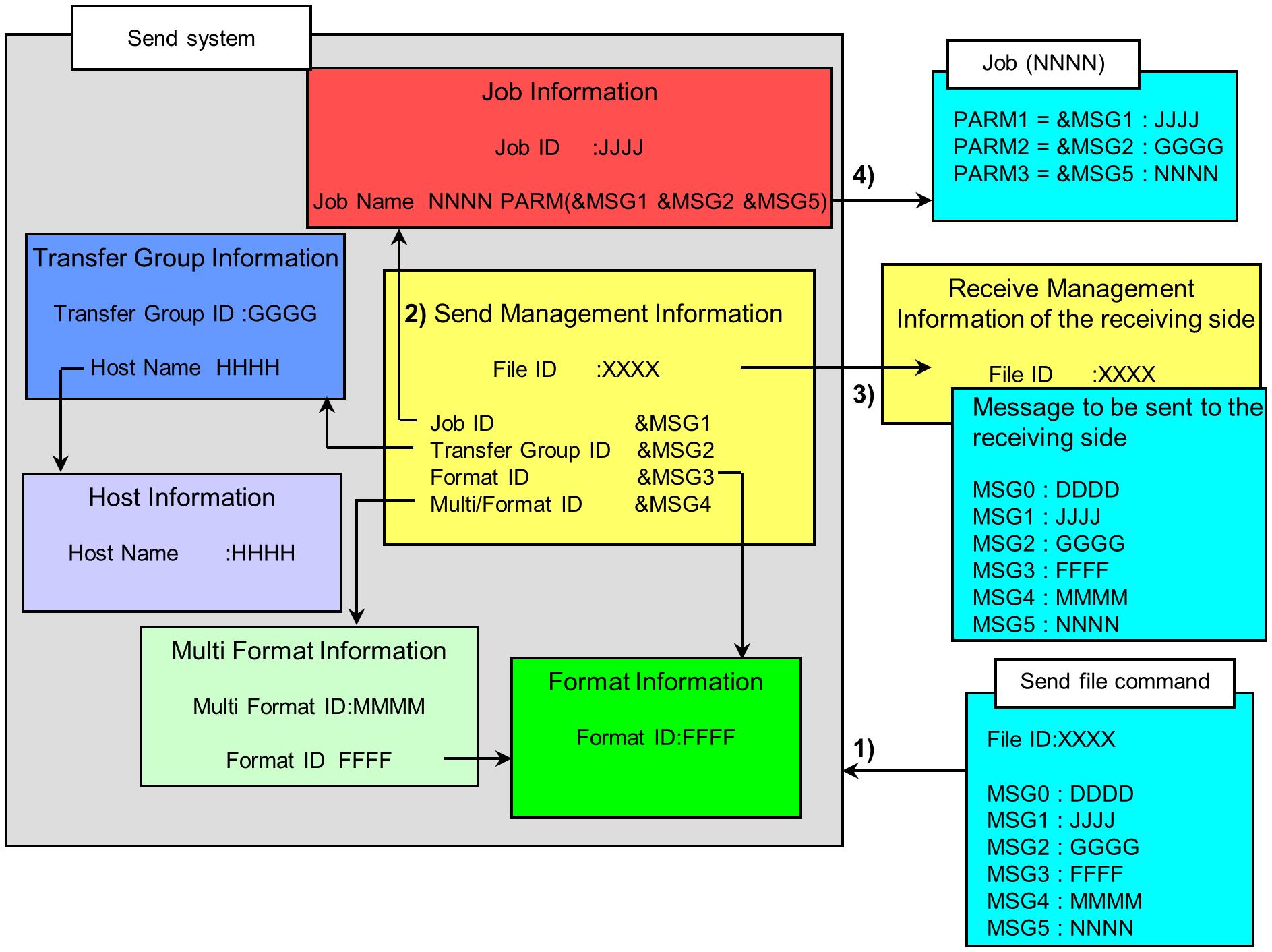 The Send system replaces '&MSG0' to '&MSG5' and '&MSGL0' to '&MSGL1' that are specified in the record of the File ID of the Send Management Information, which has been transmitted from the Send Request command, with corresponding transmitted messages. HULFT carries out sending according to assigned values.