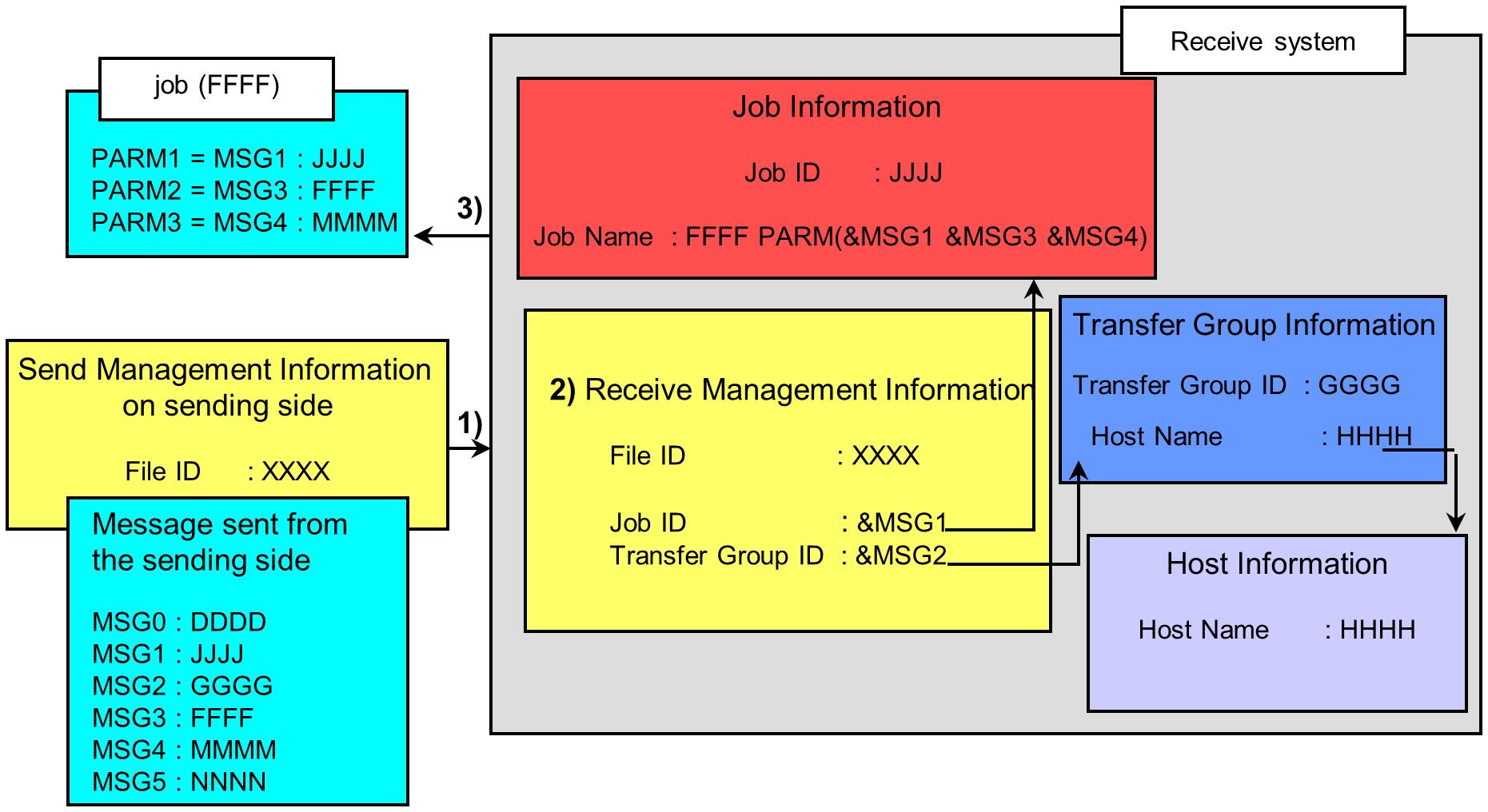 The Receive system assigns the message strings that are transmitted from the Send system to environment variable substitutions ($MSG0 to $MSG5, and $MSGL0 to $MSGL1) so that Post-receive Job can replace the values of the Job Information with the transmitted messages.