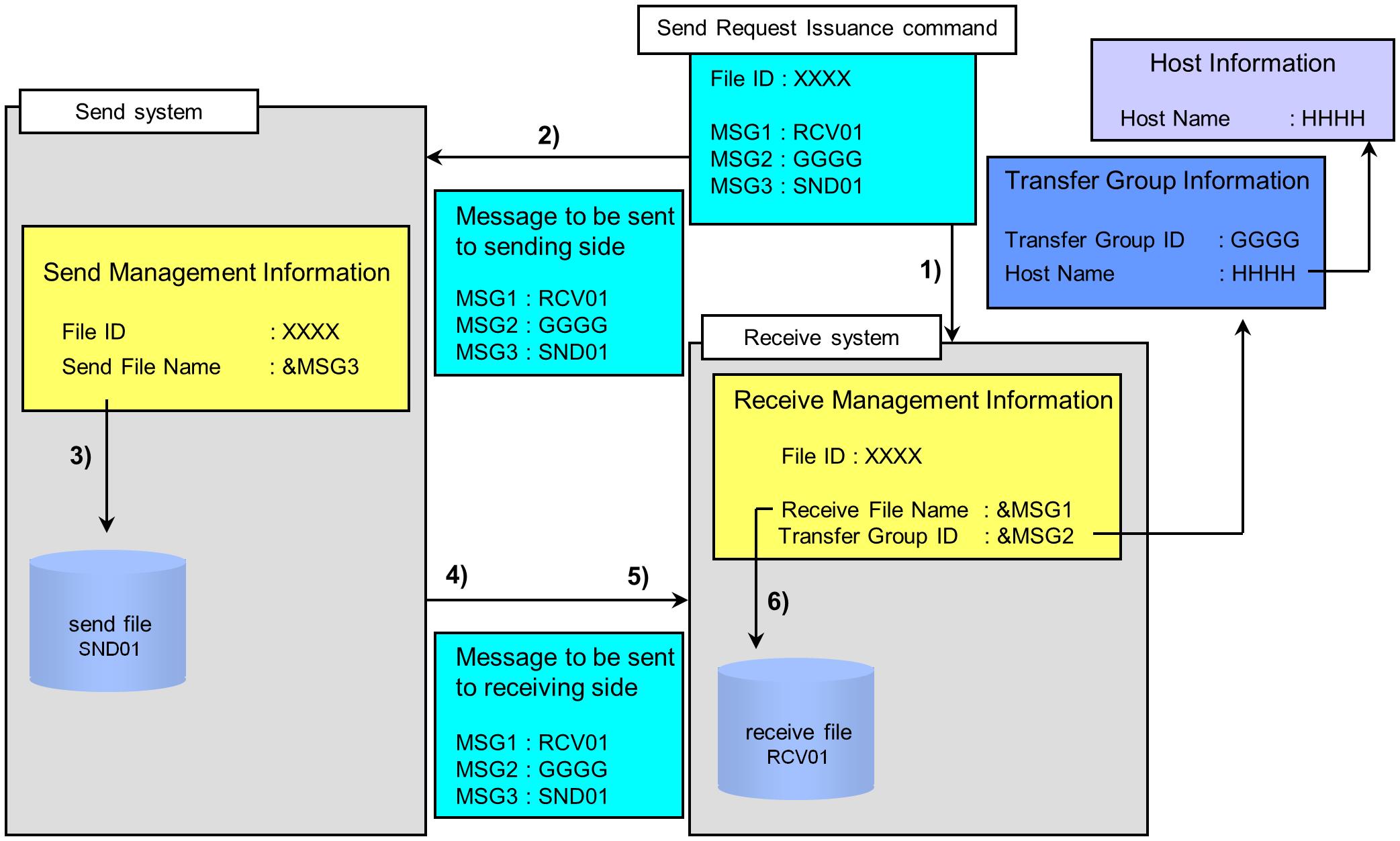 The File ID and the Message are specified in the Send Request command. The Send Request command replaces the substitutions, which are registered as $MSG0 to $MSG5 and $MSGL0 to $MSGL1 in a record of the Receive Management Information, with corresponding messages.