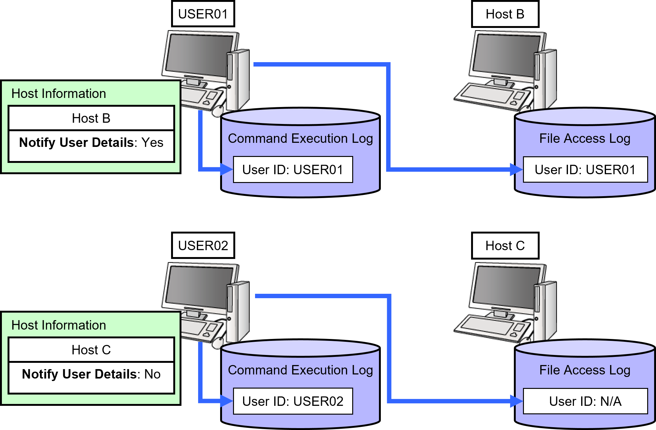 The default value of Notify User Details is '(N) No.' When the operation log output function is used, it is necessary to set this field to 'Yes (Y)' on each host to which you intend to send notification of the user ID.