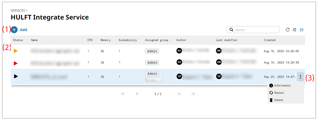 You can manage your HULFT Integrate services here. You can perform operations such as creating, restarting, and deleting services and viewing detailed information.