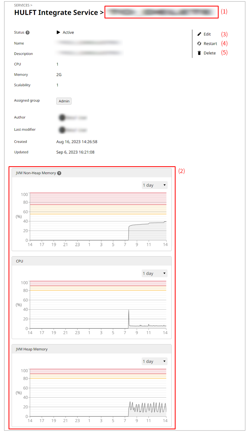 Displays detailed information about the selected service. (You can edit, restart, or delete the HULFT Integrate service that is displayed.)
