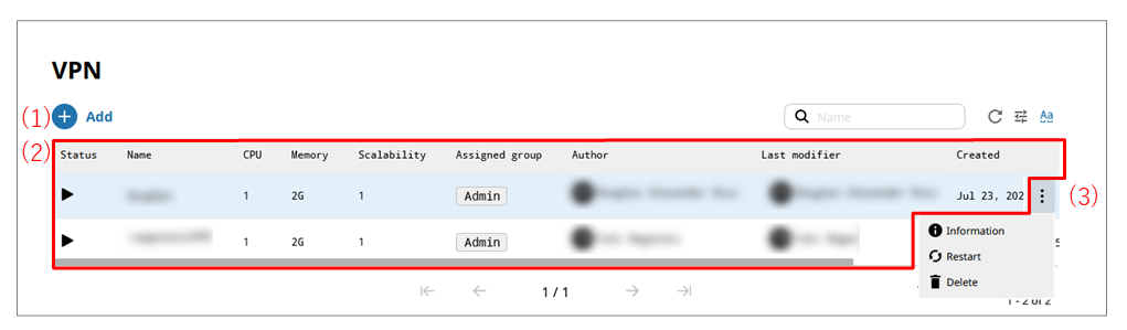 You can manage your VPN services here. You can perform operations such as creating, restarting, and deleting services and viewing detailed information.