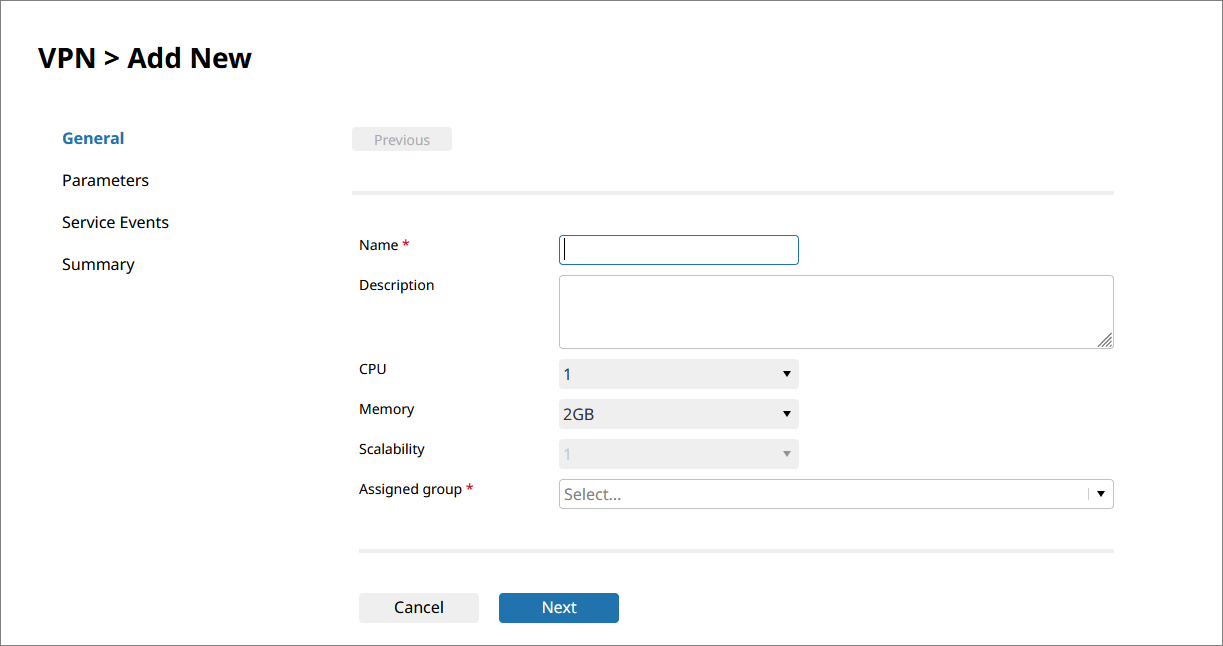 Grant permissions to the group that needs to operate the services. When you create VPN services, determine the allocation of CPU resources and the memory size depending on the scripts or data being handled.