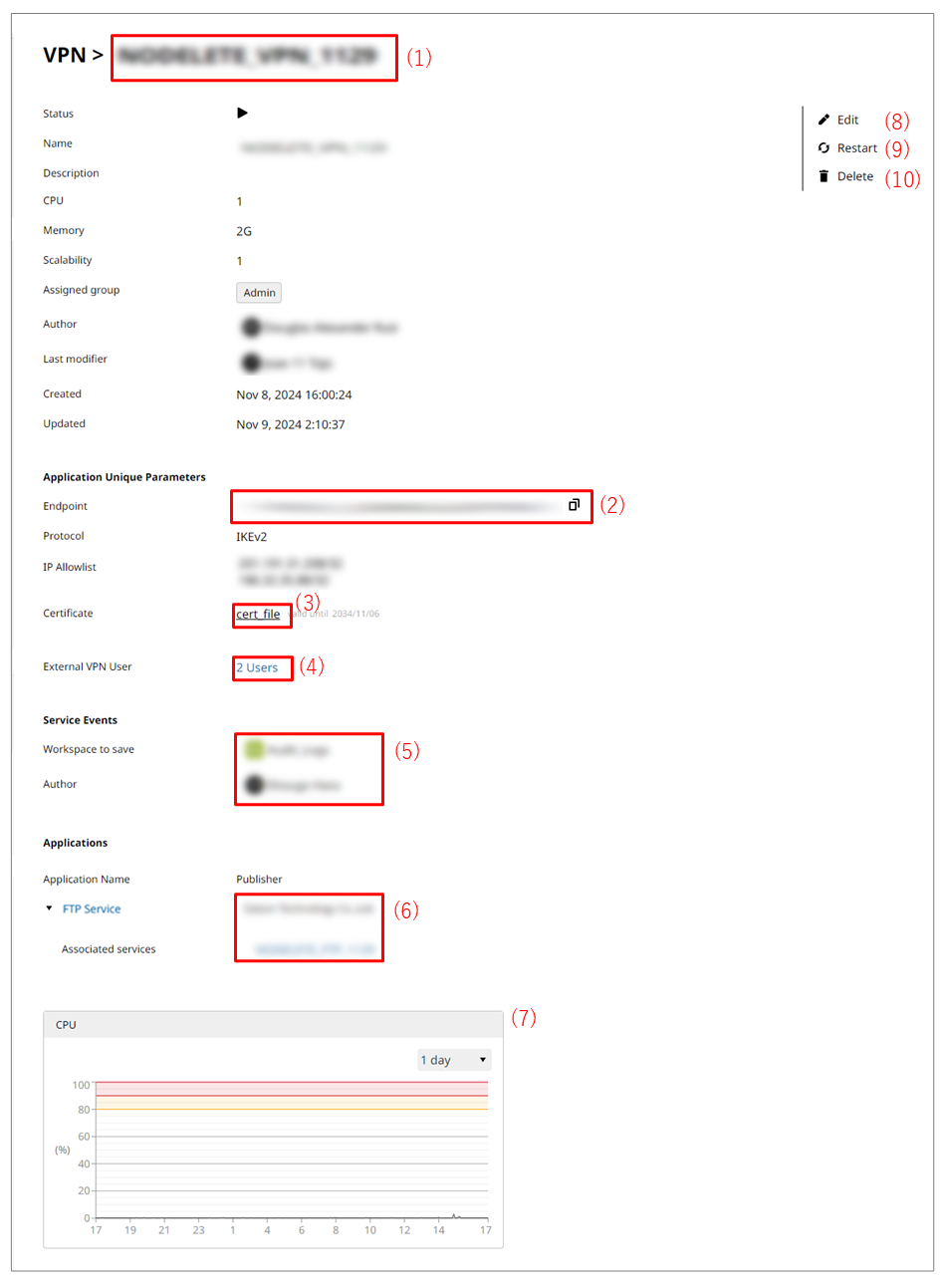 Displays detailed information about the selected service. You can edit, restart, or delete the VPN service that is displayed.