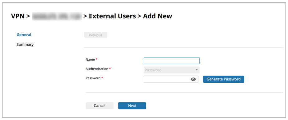 To open this page, select Add on the VPN > VPN service name > External Users page.