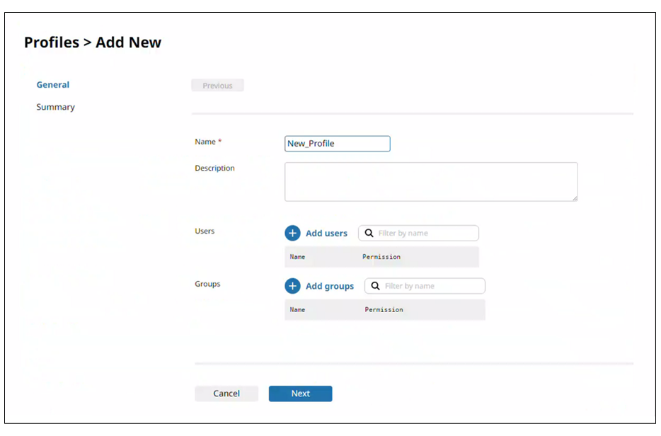 To create a new profile, select Add on the Profiles page and enter resource information.