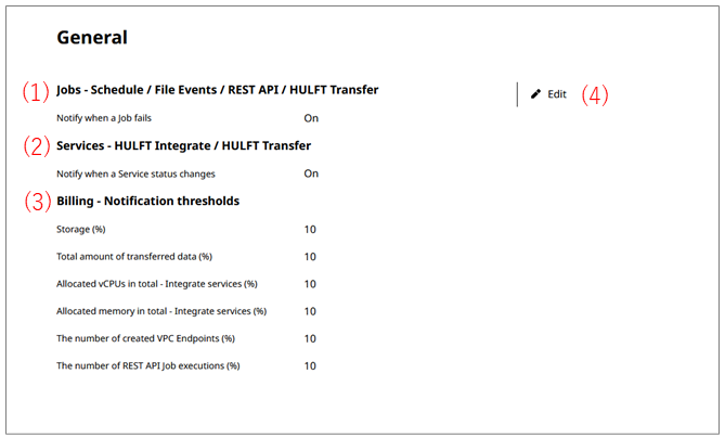 For functions that are subject to additional fees when usage exceeds a specific value, you can set a threshold (%) based on the value specified in your contract and configure the setting to send a notification if the set value is exceeded.