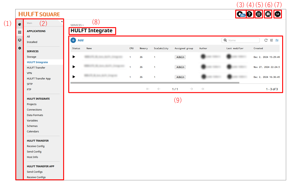 On the left side of the pages on the HULFT Square site, you can see the navigation menu. Depending on what item on the global navigation menu you select, you can display the settings menu for services, resources, and jobs, the menu for checking execution results, and the settings menu to manage HULFT Square as a whole.