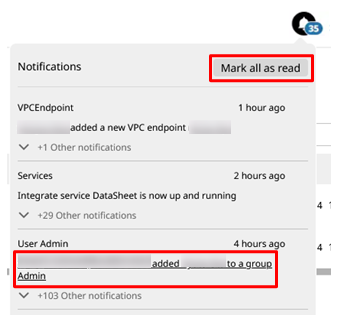 The number of unread notifications is displayed on the icon. To mark all the notifications as read, select Mark all as read. Each user manages the status of notifications as read or unread.