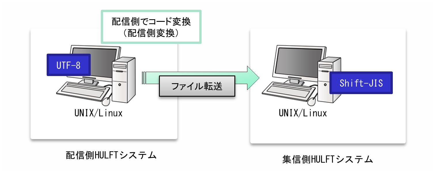 HULFTでは、以下の転送タイプの場合に、配信側ホストで変換するか、集信側ホストで変換するかを配信管理情報のコード変換で指定します。