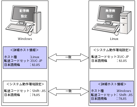 ここでは、LinuxとWindowsの機種間での日本語コードセット変換の例を元に説明します。