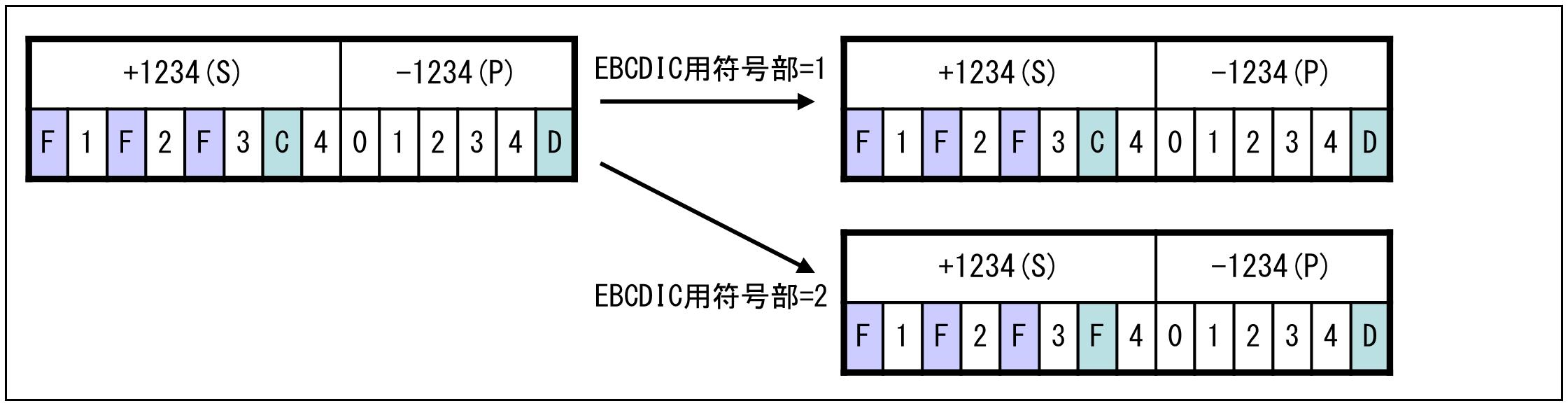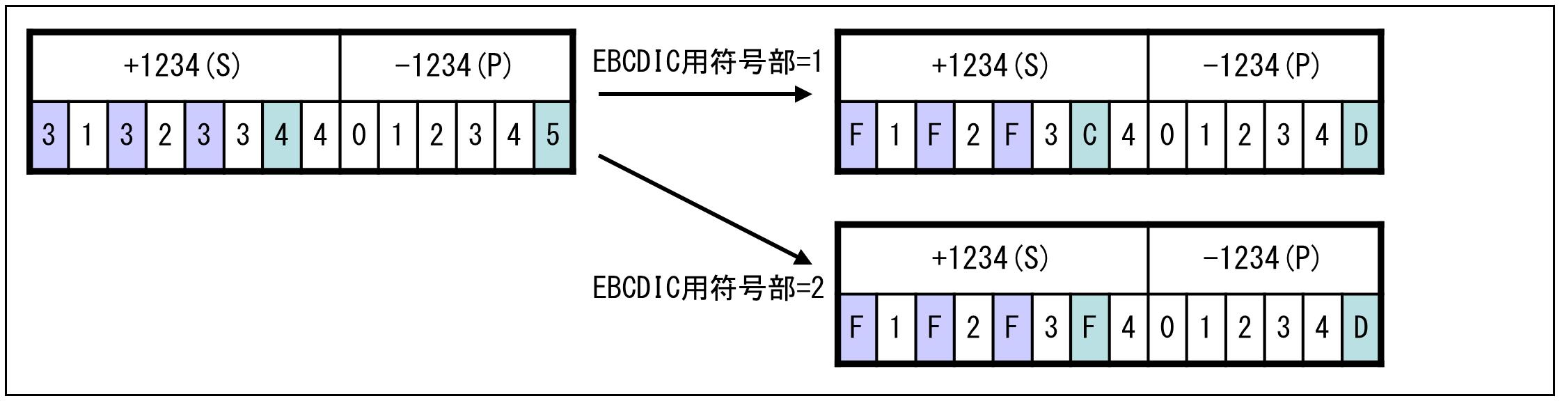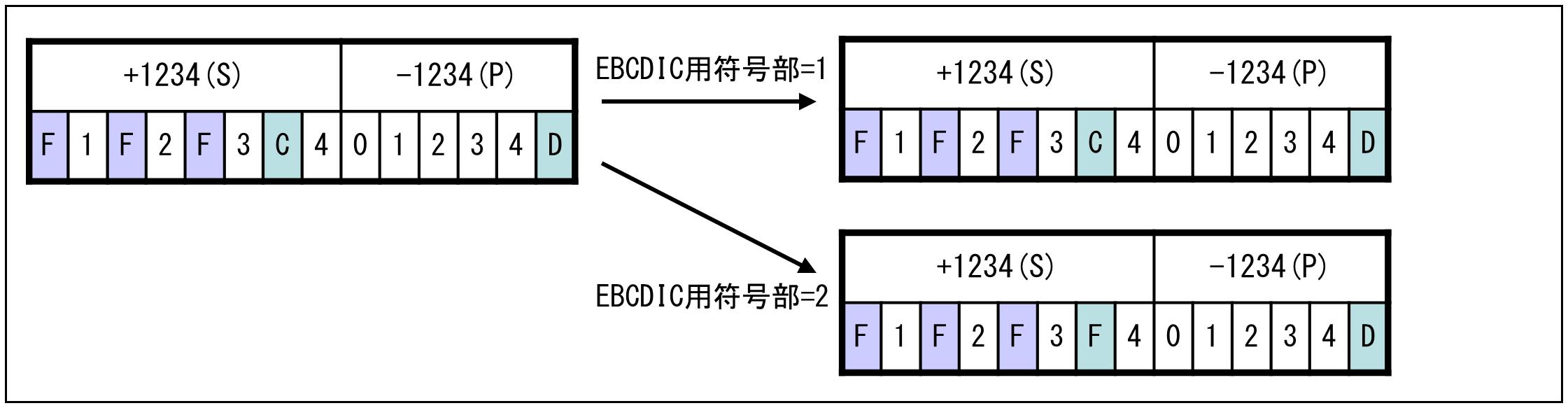 この設定は、システム動作環境設定のパック・ゾーン変換の値が“S”の場合に有効です。変換時の符号部、ゾーン部はシステム動作環境設定のASCII用符号部およびEBCDIC用符号部にて選択できます。