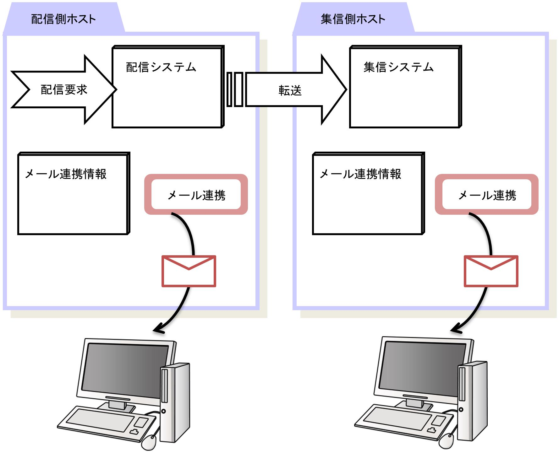 配信処理および集信処理が完了したときに、メールを送信できます。この機能を「メール連携」といいます。配信ファイルを添付してメールを送信することもできます。