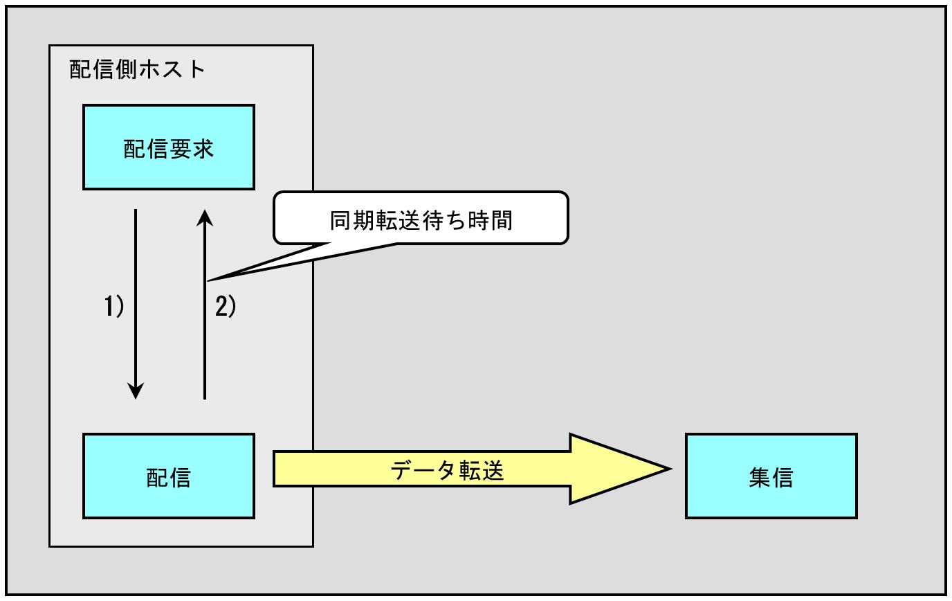 同期転送の場合、配信システムがファイル転送を終了するまで、配信要求コマンドは待ち状態になります。