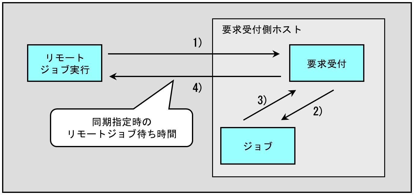 ただし、4) でリモートジョブ実行コマンドが通知を待つための設定時間が短かった場合、リモートジョブ実行コマンドはジョブタイムアウトで終了します。