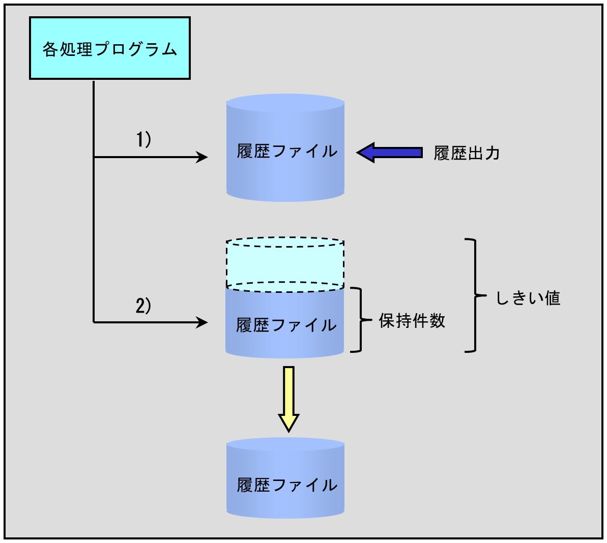 各処理プログラムは、履歴出力後に履歴レコードの件数を確認し、しきい値を超えた時点で古いレコードを保持件数分残し削除します。