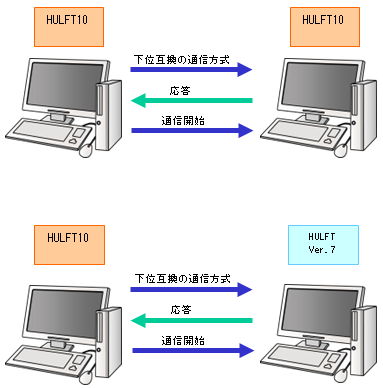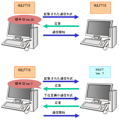 HULFT10から相手ホストに接続する場合、まず拡張された通信方式で接続を試み、その応答を見て相手ホストがHULFT7だと判明したら、改めて下位互換の通信方式で接続します。