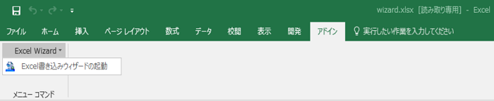 「アドイン」タブの「Excel Wizard」から「Excel書き込みウィザードの起動」を押下します。