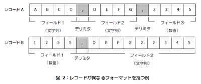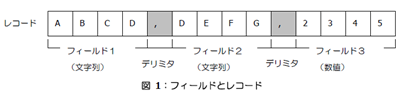 可変長ファイルでもっとも基本的な構造はレコード(record)です。レコードはテキストファイルの1行を表しており、行頭から行末(改行文字)までを1レコードと呼びます。各レコードは複数のフィールド(field)で構成されており、各フィールドは任意の文字列(デリミタ)で分けられています(図1)。