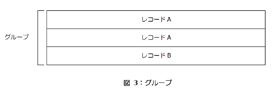 複数のレコードをひとまとまりとして扱うのがグループ(group)です(図3)。グループに含まれる各レコードは可変長ファイルに現れる順番に並んでおり、各レコードで指定されているフィールドの数や型が可変長形式のテキストファイルと完全に一致する必要があります。
