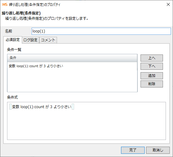 繰り返し(条件指定)処理のプロパティ設定は以下のとおりです。