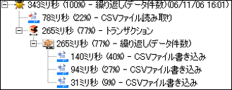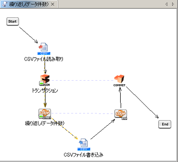 ファイル系コネクター書き込み処理を繰り返し処理中に配置する場合、繰り返し処理全体をトランザクションで囲むことで繰り返し単位での書き込み先ファイルの開閉がなくなり、パフォーマンス低下を防ぐことができます。